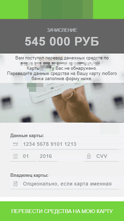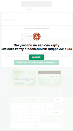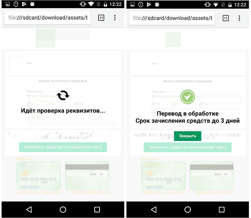 Таким образом, приложение практически не оставляет пользователю возможности ввести данные другой карты или случайные цифры, поскольку происходит проверка и корректности номера карты, и соответствия введенных данных той информации о карте, которая была ранее получена злоумышленниками.