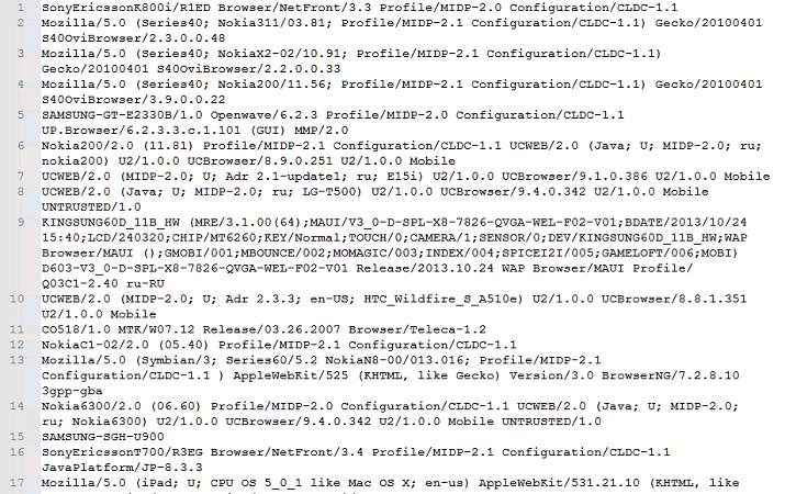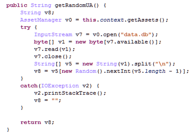 В каталоге assets троянца содержался файл data.db со списком возможных значений (порядка нескольких тысяч) поля User-Agent для команды PAGE (загрузить указанную веб-страницу). Если значение этого поля не пришло от C&C, то оно выбиралось из файла data.db псевдослучайным алгоритмом.