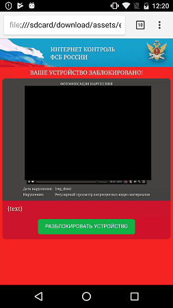 - Зловред показывает страницу-вымогатель (extortionist.html), блокирующую устройство и требующую «заплатить штраф» для его разблокировки. На скриншоте черным прямоугольником закрыты порнографические материалы.
