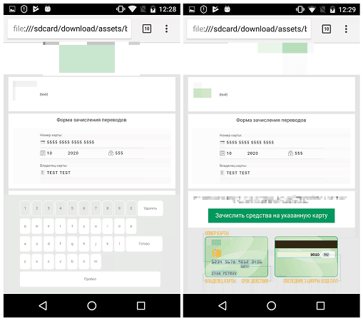 - Зловред показывает фишинговую страницу для ввода данных банковской карты (bank.html). Страница маскируется под легитимную банковскую форму и блокирует экран устройства до ввода всей требуемой информации. Она даже имеет свою виртуальную клавиатуру, которая якобы защищает жертву от кейлоггеров.