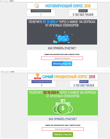 Чтобы принять участие в розыгрыше, пользователю предлагают сделать взнос, от размера которого часто зависит сумма приза: чем он больше, тем больше денег обещают жертве. Схема с опросами работает похожим образом: жертву просят перевести какое-то количество средств для оплаты комиссии (обработки чека и т. п.), после чего она якобы получит обещанное вознаграждение.
