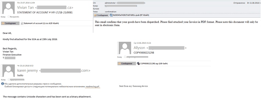 В 2018 году во вредоносном спаме сохранилась тенденция к максимальной проработке оформления писем. Злоумышленники имитировали деловую переписку, текст и тематика которой соответствовали профессиональной области компании: мошенники использовали реальные реквизиты компаний-отправителей, подписи и логотипы. Для обхода защитных решений (и убеждения пользователей в безопасности файлов) применялись нетипичные для спама вложения форматов ISO, IQY, PIF, PUB.