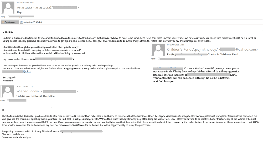 Не забывали мошенники и о других способах обмана: в течение года мы фиксировали рассылки от имени крупных благотворительных организаций, рассылки с просьбами помочь детям, путем приобретения неких данных и т. п. Объединяло все эти схемы одно: деньги предлагалось переводить в криптовалютном эквиваленте. Надо отметить, что количество таких писем было очень маленьким по сравнению с вышеописанными рассылками.