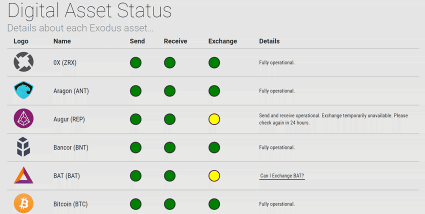 Создать и поддерживать систему, которая работает с разными блокчейнами – нетривиальная задача. В децентрализованных сетях случаются обновления, взломы и баги, поэтому иногда какой-либо актив может оказаться недоступным для работы. Для этого сайте Exodus есть страница, где показаны все поддерживаемые кошельком валюты и доступность операций с ними.