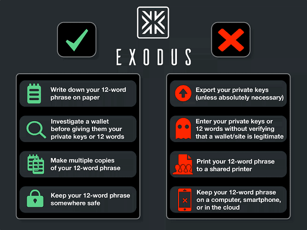 Памятка от команды Exodus. Что надо и не надо делать с сид-фразой. Например, не стоит распечатывать её на принтере, который подключен к локальной сети.