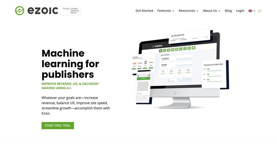 Ezoic – это рекламная сеть, ориентированная на издателя. С этой целью он дает вам возможность использовать инструмент для тестирования рекламы, тестер макета, посредничество в рекламе, прямые заказы на рекламу и предустановленные ставки для заголовков.