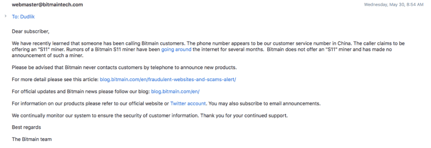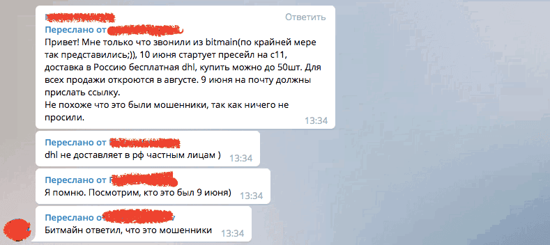 Представители компании в курсе происходящего, поэтому рассылают предупреждения и делятся подробностями. Оказывается, номер злоумышленников может совпадать с горячей линией компании в Китае. К тому же об Antminer S11 давно ходят слухи. Напоминаем, Bitmain не анонсировала эту модель.