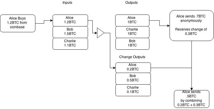 - Соединяя анонимную сдачу со сдачей, которую она получила на Coinbase, Алиса компрометирует свою анонимность.