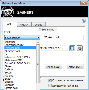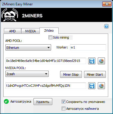 При желании пул меняется легко — просто указываем адрес кошелька другой платформы. Кстати, кошельки сохраняются по нажатию на кнопку сохранения и после клика по Miner Start.