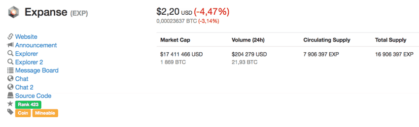 Expanse — небольшая монетка со скромными цифрами. Сегодня она занимается 407 место в рейтинге CoinMarketCap. Курс колеблется на уровне 2,2 доллара, а капитализация превышает 17 миллионов долларов. Пиковая цена пришлась на седьмое января — тогда за один EXP предлагали 9,63 доллара. В течение суток оборот монеты прыгает от 200 до 800 тысяч долларов.