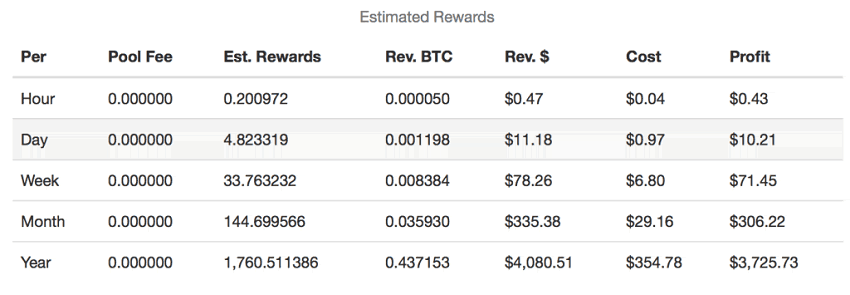 Хешрейт в 250 Mh/s будет приносить чуть больше 10 долларов в день. При постоянном курсе за месяц майнинг принесет вам 306 долларов. Прибыльность рассчитывалась по состоянию на 28 апреля 2018 года.