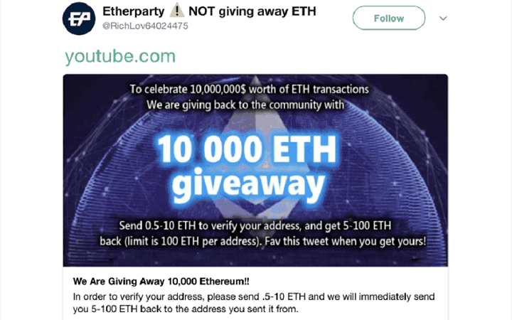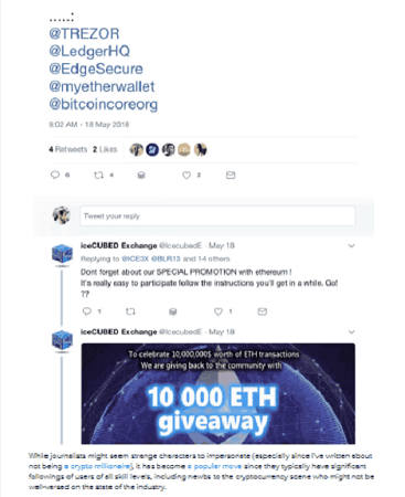 В мая южноафриканская биржа iceCUBED опубликовала в своём Твиттере пост, где упомянула самых авторитетных людей в криптоиндустрии. Среди них был основатель Лайткоина Чарли Ли, разработчик Monero Рикардо Спагни, основатель Lightning Labs Элизабет Спарк и другие. Спустя несколько минут после публикации мошенники разместили под записью объявление о бесплатной раздаче Эфиров. Таким образом читатели могли подумать, что акцию с монетами поддерживает не только биржа, но и одни их самых влиятельных людей в индустрии.