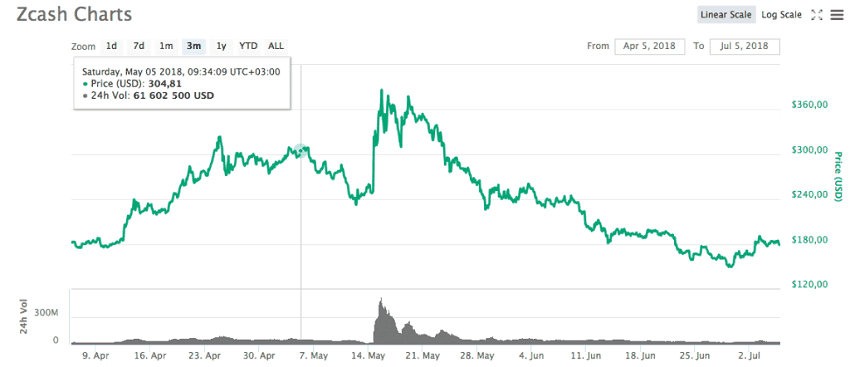 Также не забываем о курсах. В начале мая за монету ZEC просили чуть больше 300 долларов, в то время как сегодня курс колеблется на уровне 170 баксов.