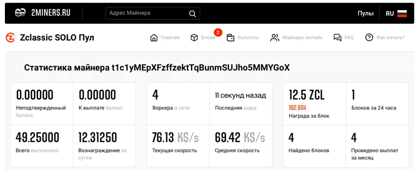Вслед за окончанием всех операций убеждаемся в их правильности. Заходим на страницу майнинг-пула 2Miners,после чего вводим кошелёк в окошко «Адрес майнера». Оно находится посередине вверху.