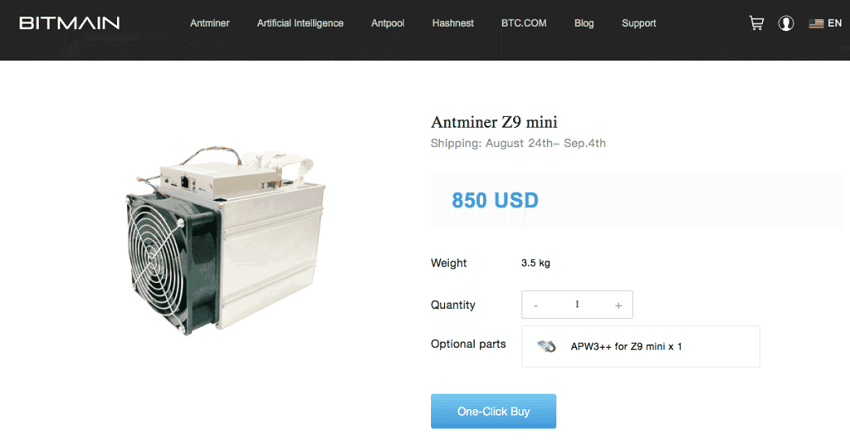 Единственный Equihash-майнер от Bitmain выдаёт 10 ksol/s при потреблении в 266 Вт. Модель компактная — сам корпус весит 2,02 килограмма. Его размеры составляют 20,6 х 12,4 х 15,5 сантиметра.