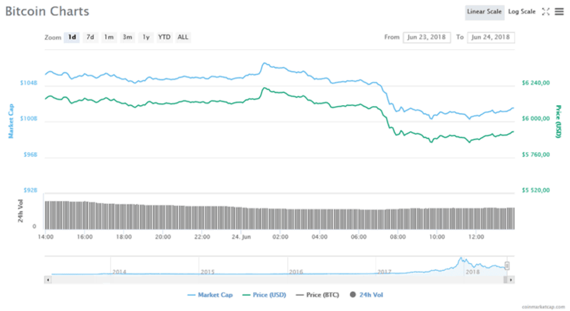 Биткоин (BTC) упал ниже 6 000 долларов США и сейчас торгуется на уровне $5 900 согласно CoinMarketCap. Таким образом первая криптовалюта потеряла около 4% цены за последние 24 часа.