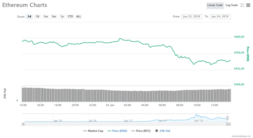 Ethereum (ETH) в последние сутки показал еще большее снижение, упав более чем на 6%. На данный момент его цена равна $445 по данным CoinMarketCap.