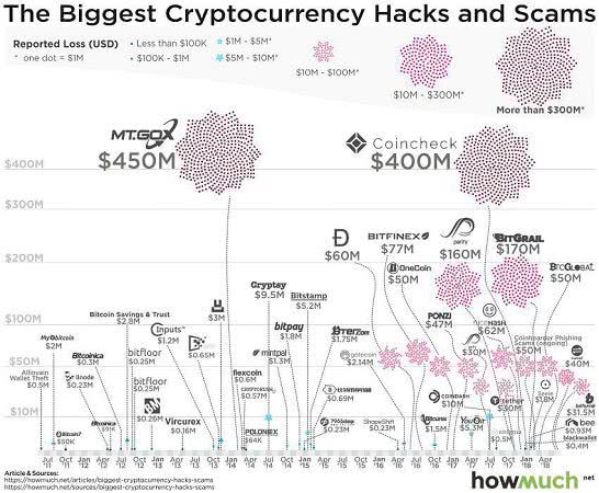 Снова данные howmuch.net. Ресурс сравнивает наиболее крупные взломы криптовалютных сервисов. “Лидеры” рейтинга Mt.Gox и Coincheck, как и большая часть участников, – криптобиржи.