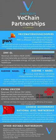 С тех пор, как проект VeChain был запущен публично, команда анонсирует партнерство за партнерством. Среди важных компаний, с которыми сотрудничает VeChain, такие гиганты, как PwC, DNV GL и BMW. И это лишь несколько крупных имен из длинного списка.