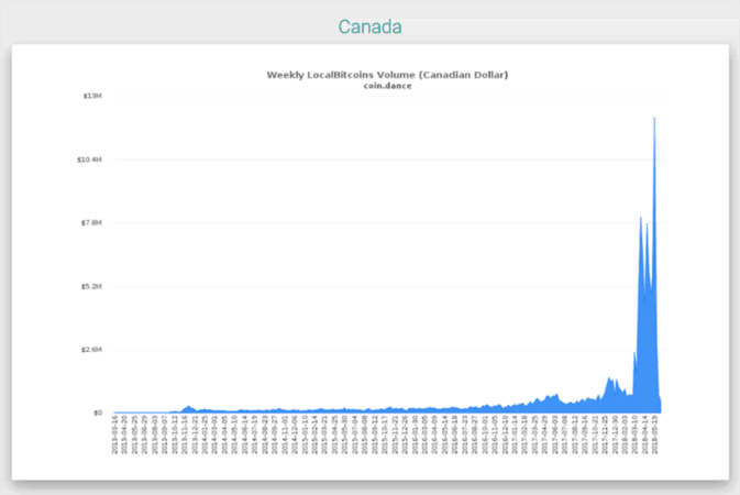 В течение недели после 19 мая рынок Канады на Localbitcoins неожиданно поставил новый рекорд объема торгов, как в биткоине, так и в местной валюте. С 19 по 26 мая оборот достиг 12,13 млн CAD (1265 BTC или около $9,3).