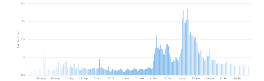 Всплеск популярности “криптокотят” также отразился на комиссионных сборах сети. Пиковые значения в декабре и январе