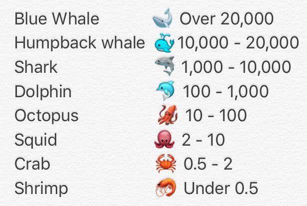 Шуточная классификация держателей биткоинов по количеству монет. От креветки до синего кита.