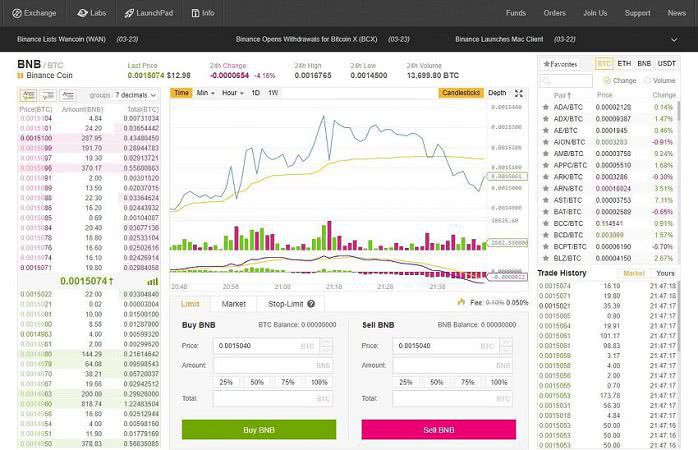 Интерфейс биржи Binance. Слева – биржевой стакан