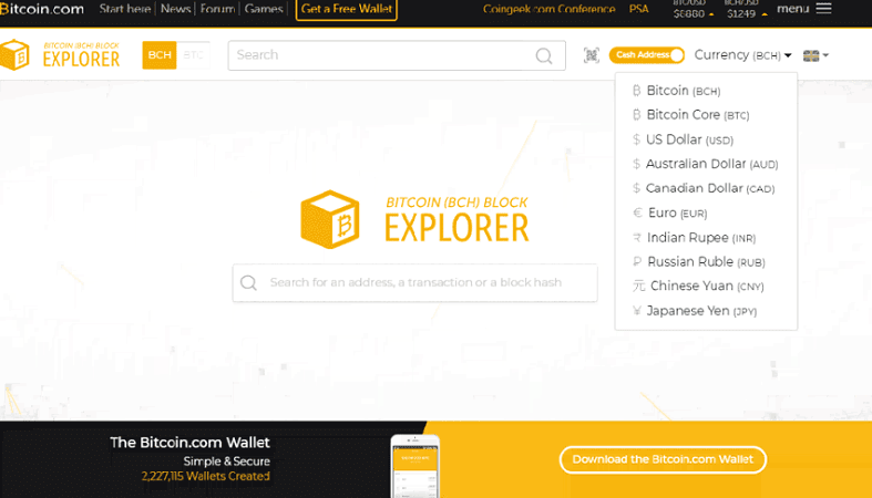 Страница поиска адресов, блоков и транзакций блокчейн-сети. Bitcoin Cash (BCH) везде называется Bitcoin.