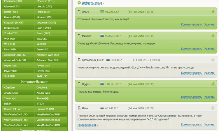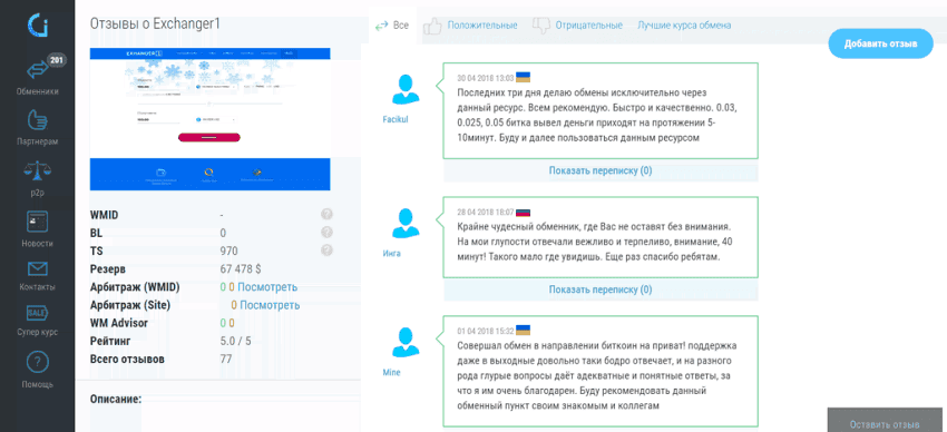 Чтобы увидеть отзывы, надо нажать на мелкие дублирующиеся циферки. Клик в любом другом месте отправляет на сайт обменника