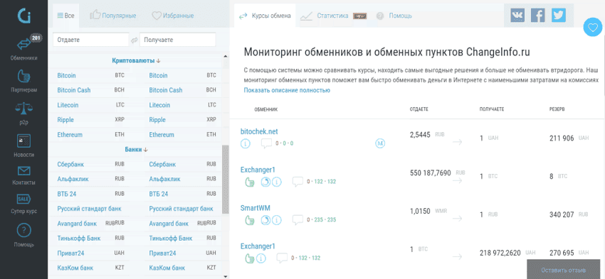 Changeinfo существует более 4 лет. На сайте представлены данные о 201 сервисе. Пользователь может сортировать обменники по резервам валют, предоставленным сертификатам и отзывам. Валютные пары можно добавлять в избранное без регистрации. Страница с ценами всячески настраивается, сортируется и содержит наглядные пиктограммы.