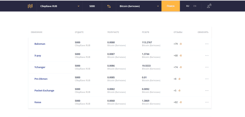 Если пользователь захочет купить биткоинов на ₽5000 с карточки Сбербанка, сайт предложит на выбор шесть ресурсов. Это потому что обменникам неинтересно работать с мелкими суммами. Если поменять ₽5000 на ₽30 000, число обменников вырастет в два раза.