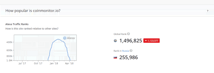 Данные alexa.com. Сайт активно развивался после запуска. Где-то феврале Coinmonitor достиг пика популярности, а затем начал снижаться. Искренне жаль