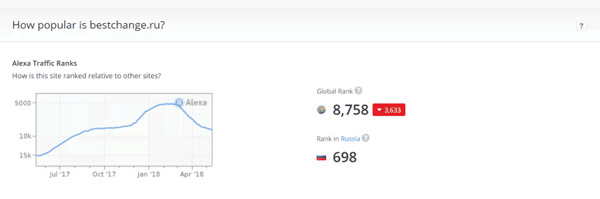 После криптовалютного бума в конце 2017-го показатели упали, но в целом BestChange продолжает расти. Данные alexa.com