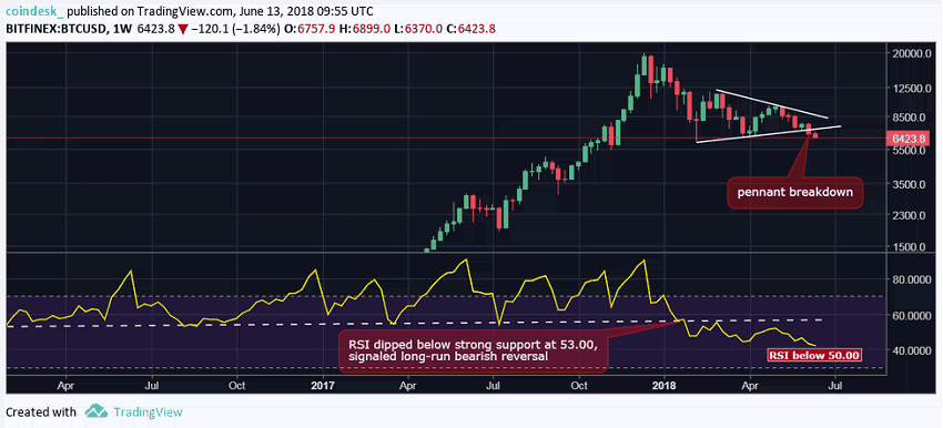 О начале движения в сторону отметки в 6 000 долларов сигнализировал прорыв линии поддержки вымпела. На недельном графике RSI упал ниже ключевого уровня поддержки при 53. Это указывало на долгосрочную смену тренда с бычьего на медвежий. Таким образом, если произойдет корректирующее ралли, вероятность долгосрочного восстановления кажется иллюзорной.