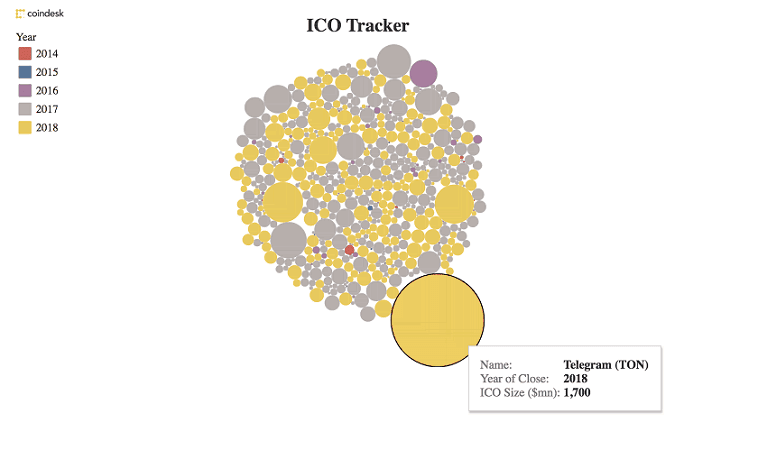 Однако пока неясно, как следует воспринимать рекордную продажу токенов Telegram. В ходе ICO им удалось привлечь $1,7 миллиардов. Изображение, сделанное ICO Tracker от CoinDesk, показывает следующее: