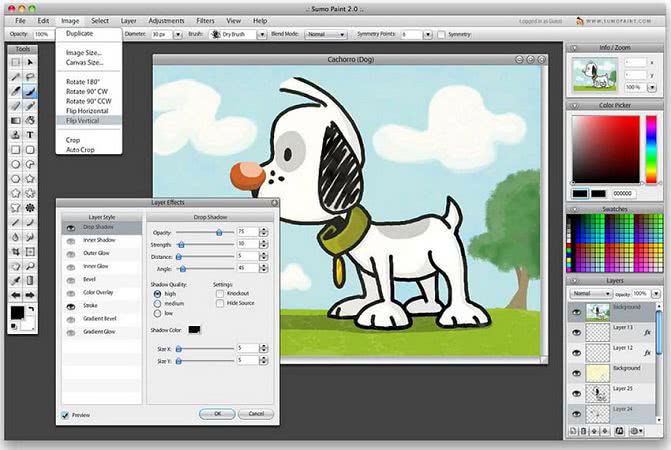 SumoPaint позиционируется как манипулятор изображений с большим количеством опций, не все из которых предназначены для работы с фотографиями. Собственный формат файла Sumo также обеспечивает неразрушающий вариант сохранения. Инструмент включает в себя множество кистей, форм, цветов и градиентов для запуска любого проекта. Он также позволяет использовать слои и поставляется с большим количеством фильтров.