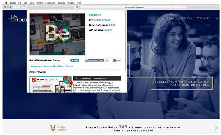Одним нажатием маленькой кнопки на панели инструментов вы можете увидеть тему и вариант, а также версию WordPress, которая работает. Он также обнаруживает другие плагины, которые используются, и включает краткое описание их со ссылками и ценой.