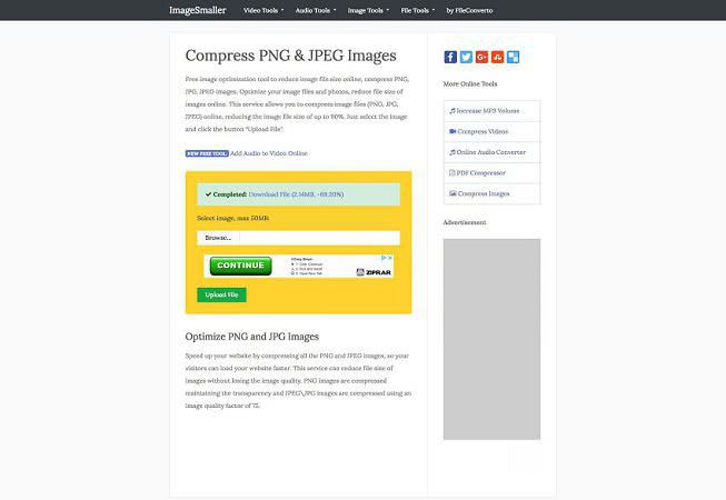— это простой скрипт, который позволяет сжимать изображения JPG или PNG. Существует максимальный размер изображения — 50 Мб, и вы можете загрузить только одно изображение за один раз. ImageSmaller также поддерживает свой сайт рекламой, и вы должны быть осторожны, чтобы не нажать на темный шаблон объявления при использовании пользовательского интерфейса.
