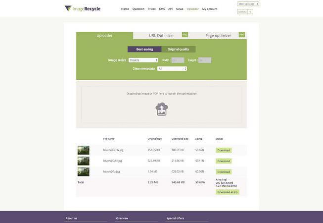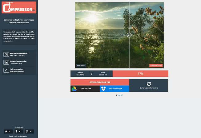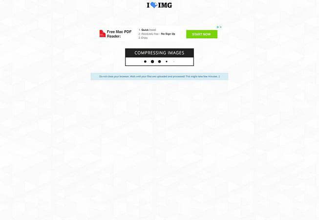 — довольно стандартный сервис, который зарабатывает на рекламе. Существует очень мало информации при сжатии изображений, а когда процесс сжатия завершен, сервис показывает вам, сколько он сохранил в процентах, однако сам прогресс не ясен, что может оказаться затруднением, если вы сжимаете много изображений.
