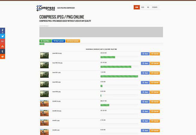 — еще один бесплатный сайт, который поддерживает себя с помощью рекламы. Так что будьте осторожны, чтобы не быть захваченным ей. Нажмите «Добавить файлы“, затем ”Начать загрузку». Хороший диапазон индикаторов прогресса показывает вам исходный размер сжимаемого изображения и изменения в размере файла.