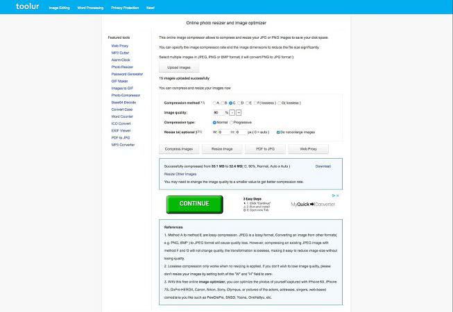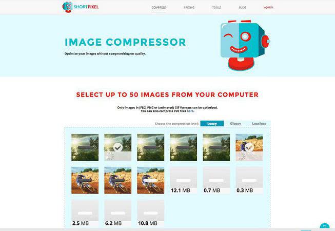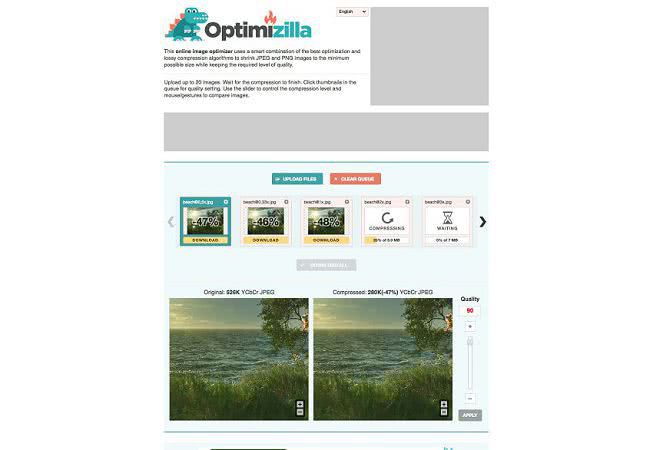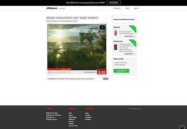 ориентирован на плагин Adobe Lightroom/Photoshop. Имеется бесплатная онлайн-версия, которая позволяет загружать альбом целиком. Вам также нужно подождать некоторое время, пока изображения загрузятся, кроме того, инструмент не предоставляет визуальной обратной связи о прогрессе, а пользовательский интерфейс весьма запутан. Одна удивительно полезная функция заключается в том, что JPEGMini отправляет вам электронные письма, когда ваши файлы готовы, поэтому вы можете заниматься другими делаит, пока он работает.