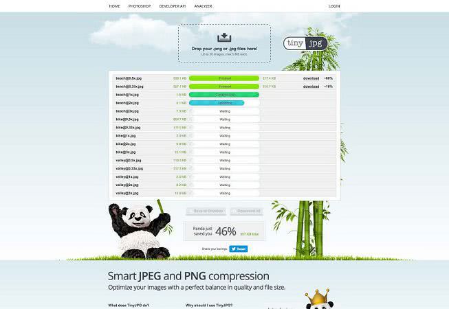 Кто не любит панд? имеет сопутствующий сайт TinyPNG, который так же неплохо знать. Существует также опция Go Pro, всего за 25 долларов США в год, что позволит вам повысить максимальный размер изображения до 25 Мб, плюс вы получите объятия от панды Джорджа.