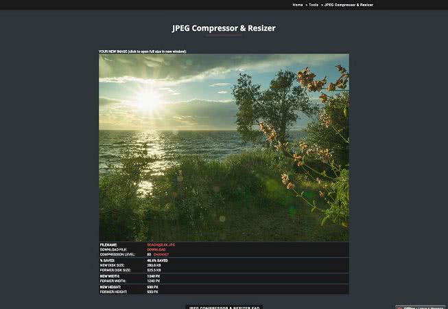 предлагает множество инструментов для сжатия вашего сайта, но нас интересует только инструмент сжатия JPG. Опять же, это ручной инструмент, то есть вы должны вручную сжимать каждое отдельное изображение по одному за раз. Он предлагает хороший выбор изменения уровня сжатия, но если вы не опытны, для вас это станет делом проб и ошибок, прежде чем вы найдете лучшие настройки.