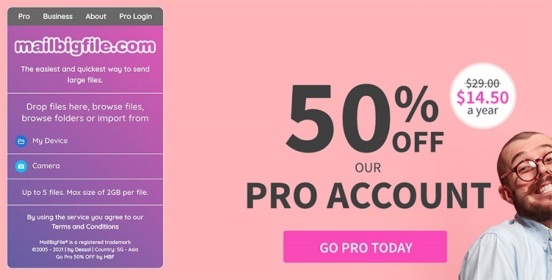 JumboMail позволяет отправлять файлы размером до 2 ГБ без регистрации учетной записи. Вы можете пригласить своих друзей в JumboMail, чтобы увеличить ограничение с 2 ГБ до 5 ГБ, но вам придется зарегистрировать учетную запись. Загруженные файлы будут храниться в течение 7 дней до истечения срока их действия.