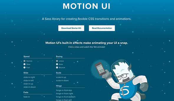 Motion UI — это мощная библиотека Sass для создания переходов и анимации CSS. Первоначально она была интегрирована в Foundation для приложений, но теперь ее можно использовать как автономную библиотеку. Используйте ее, чтобы добавить интересные эффекты, такие как ускорение, смягчение, слайды, масштабирование и многое другое.