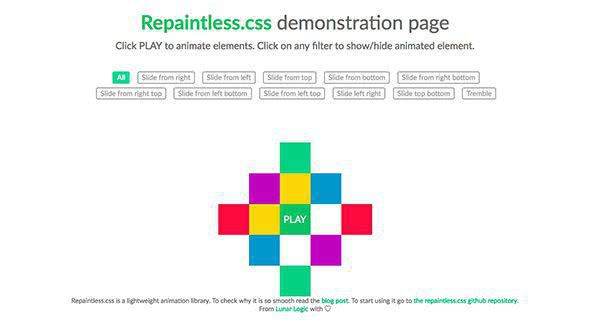 Repaintless.css – легкая по весу библиотека анимации CSS с десятками классных анимаций, которые сделают ваш сайт интерактивным, не замедляя его работу при этом. С ней вы сможете с легкостью добавлять слайд-эффекты.