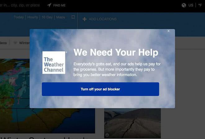 Хорошо, я захожу на сайт Weather.com, где реклама — один из, или основной вид дохода. Существует множество сайтов, которые просят вас отключить блокировщик объявлений, чтобы прочитать полную статью. У меня нет проблем с этим, и основной абзац текста здесь в порядке.