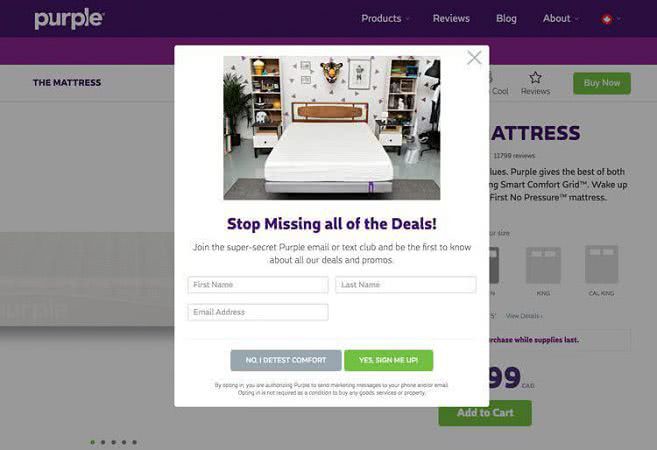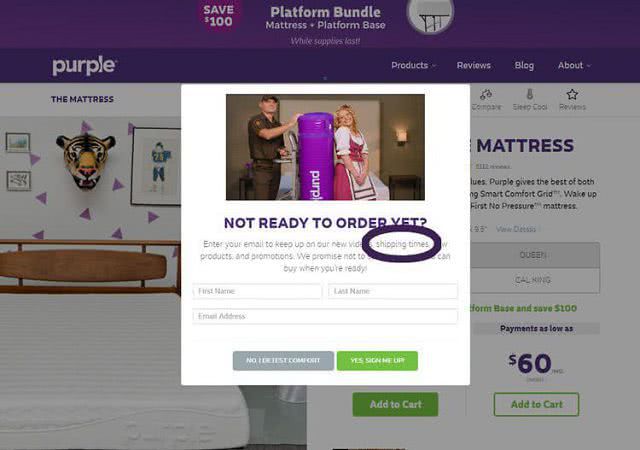 Я нашел второй пример всплывающего окна от Purple (ниже), и должен отдать им должное. Текст на этой странице значительно убедительней. Если вы посмотрите на раздел, на котором мы находимся (в фиолетовом цвете), он говорит, что если вы подписались, они будут держать вас в курсе событий. В самом деле? И что вы будете слать? «Привет, отличные новости! Мы можем отправить вам матрас через две недели!». На этом сайте это немного не уместно, не находите?